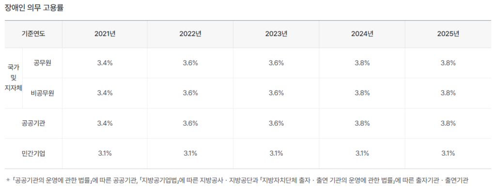 – 국가·지방자치단체와 월 평균 상시근로자 수 50명 이상을 고용하고 있는 사업주에게 장애인을 일정비율 이상 고용하도록 의무를 부과하고, 미준수 시 부담금(월평균 상시근로자 수 100명 이상) 부과